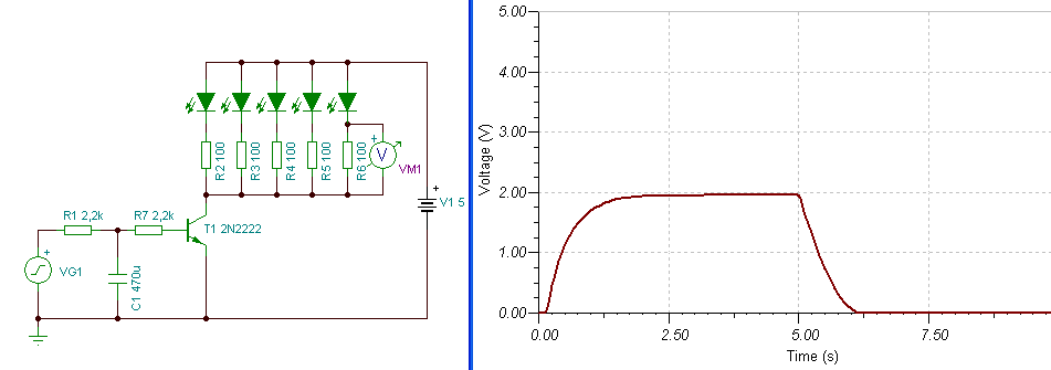 - Az 5V tápfeszültség miatt, nem kapcsolható sorba sajnos még két Led sem. (Én nem szeretem a párhuzamos Led kapcsolásokat, így mindegyik elé, egy-egy ellenállást tettem.) Öt Led, 100mA áramot jelent, és 100-as bétával ez 1mA bázisáramot igényel. Így a bázis ellenállásnak kb. 4,3kohm-nak kell lenni. - Ha csak 5db dióda van a 2N kollektorában, akkor még megoldható a lassú analóg ki-be kapcsolás. (leszimuláltam) - De több dióda esetén, már nagyobb bázisáram kell a tranyó részére, azt mér nem biztos, hogy meghajtja a CMOS, és egyre nagyobb kondi is kellene. De próbáld ki. - Megépítettem egy egyszerű "PWM" megoldást is. Ha a mellékelt FET a meghajtó, akkor a Led-ek akár 2A-t is fogyaszthatnak. - Amúgy a Led-ek fényerő szabályozása nem olyan látványos. De próbáld ki, mi éri meg és mi nem. üdv! proli007
