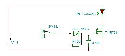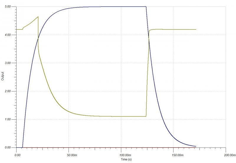 Fetem van alaplapról leműtött logic fet n csatornás iszonyat kis ellenállással.én úgy gondoltam hogy a cmos meghajtja egy diódán keresztül a fetet a diódával párhuzamosan egy ellenállás utána egy kondi majd a fet gataje. Mikor bekapcsolt akkor a dióda kősöntöli az ellenállást mikor meg a alacsony szintre kapcsol akkor az ellenálláson keresztül sül ki a kondi így lassacskán fogy ki és ezáltal kisebb elko is elég a szép látványhoz.Mint a képen. Leszimuláltam ezt csinálja amit kell az ellenállás és a kondival be is lehet állítani