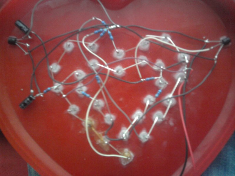 Nekem egyik osztálytársam rakott össze egy ilyen szívet és neki is hasonló problémája volt, hogy egyfolytában világított egy adott része, míg másik része nem, majd egypár újraforrasztás után már villogtak az addig csak folyton világított rész. Végül majdnem az összes forrasztás átforrasztása segített neki! Tehát javaslom a forrasztásaid áttekintését! Én összeraktam magamnak lég szerelve már két szívet is amelyek elsőre tökéletesen működtek! Mivel extra fényerős LED-eket használtam, ezért szükséges volt az előtétek értékének csökkentése és a kondenzátorok értékének növelése! A szíveket az általam átalakított dobozba helyeztem el. Teszek fel róla képeket, hogy hátha majd valaki ötletet merít belőle.