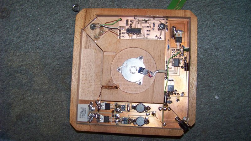 Ez nagyon szép lett, gratula. Már nagyon várom a végeredményt Közben én sem tétlenkedtem ám beleraktam a PIC et is így már lehet vele a sebességet szabályozni és ki be kapcsolni az órát. Tulajdonképpen kész van az órám , kentem rá egy kis fényes lakkot is....pár kép Még annyit ,hogy ha beüzemeled a wireless powert és elkezd induláskor cincogni a HDD motor és nehezen indul az azért van mert a mocira vezető kábelek összeszedik a nagyfekit és meghülyítik az elektronikát, ha árnyékolt kábellel vezeted akkor megszűnik a hiba.