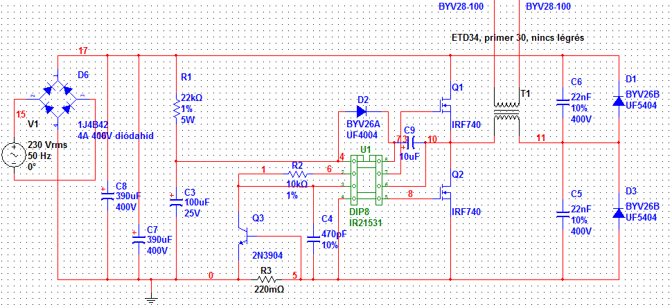 A szórt induktivitást konkrét előre megtervezett értékre kell beállítani! Az rohadtul nem úgy van, hogy ahogy esik, úgy puffan! Küld el, hogy milyen frekit akarsz használni (gondolom arra, meg a vas gerjesztésére mértetezted a primer menetszámot) és milyen a félhidat alkotó két feted típusa. Abból megaszondom, hogy mekkora legyen a szórt induktivitásod és a kondér a rezgőkörben úgy, hogy a rövidzárat is elviselje (két dióda a kondérokkal párhuzamosan elég, meg jó hűtés a feteknek, (ha egyszerűbe nyomod, később lehet elegánsabban is). Ha akarsz ZVS módot, akkor azt is kiokumlálhatom szimulátorba, de akkor mindenképpen a 0,6us DT-s IC-t kell használni, ami drágább.