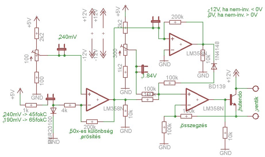 A lényege: Az MBR20100 diódán kb. 50mV feszültség változás van, mikor langyos, és forró. Ezt erősítem fel 50x-esen, így lesz belőle 0-2.5V-ig feszültség. És lesz negatív feszültség is, mert mikor hideg a dióda, akkor a 240mV-hoz képest negatív a különbség, és ezt erősítem 50X-esen. Ezt hozzáadom az 1.84V-hoz, ugyanis 1.9V-on már pörögnek a ventijeim. Mikor hideg a dióda, kb. 1.6V van a ventiken, mikor forró, akkor 5V. Felspékeltem még azzal, hogy mikor az 50x-es műv. erősítő kimenetén negatív feszültség van (tehát hideg a dióda), akkor kb. -12V-ot ad az összegző bemenetére, tehát a tranzisztor le fog zárni, ventik nem pörögnek. Amint ez a negatív feszültség nagyobb, mint 0V, akkor a műv. erősítő pozitív tápot ad ki, amit ha megkapna az összegző rész, azonnal maxon forognának a ventik, amíg le nem égnek a 12V-tól. Ezért a kimenetre került egy dióda, ami nem enged pozitív feszültséget az összegzőre. A diódán esik feszültség, és az LM358 sem 0V-ot ad ki a kimenetén, ezt ki lehet küszöbölni az 1.84V feljebb állításával. Mi a véleményetek?