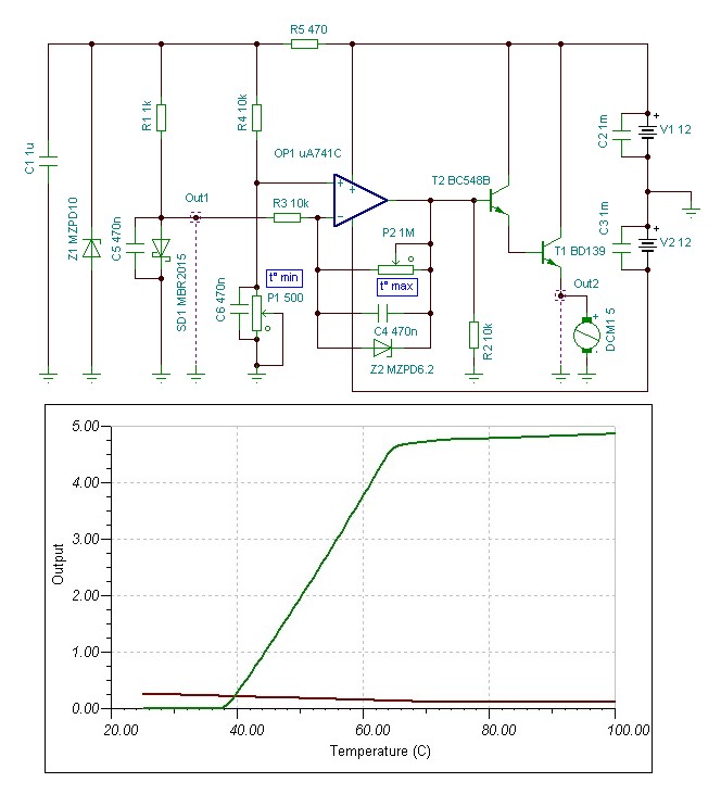 A ventillátor indulási hőmérsékletét a P1 -gyel, a max. fordulathoz tartozó hőmérsékletet pedig a P2-vel állítod be. A max. kimenő feszültséget (a max. hőmérséklethez tartozó feszültséget a ventillátoron) a Z2 -es zéner értékének változtatásával állíthatod be. Most 5V -ra van állítva. [6,2V - 1,2V (a két tranzisztor B-E átmenete)] Az áramkört Tinában teszteltem, a diagramon a piros görbe a Schottky dióda feszültségének változását mutatja(Out1), a zöld görbe pedig a ventillátoron lévő feszültség változását(Out2) a hőmérséklet változásának függvényében.