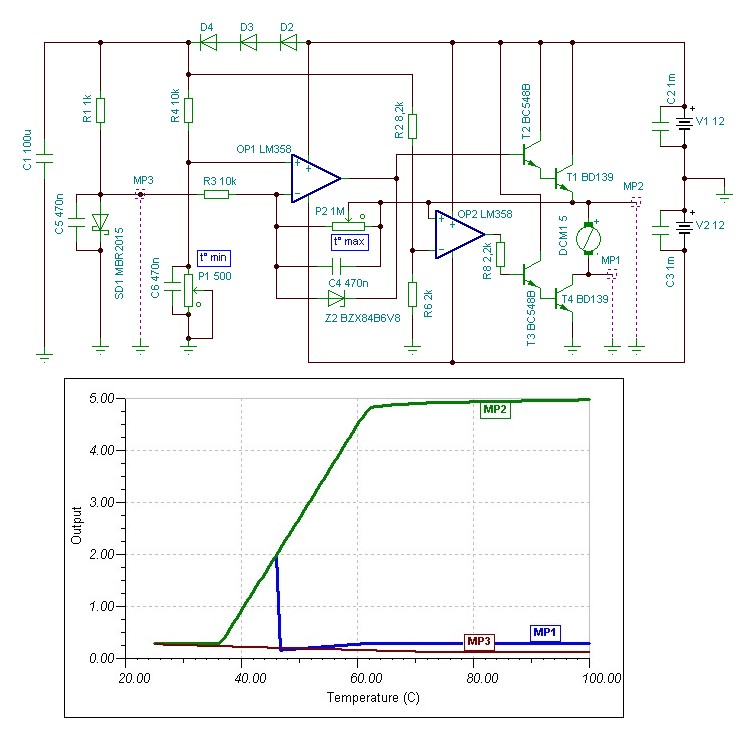 Itt a rajz, csatoltam. A hőmérséklet változásra csak az egész áramkört tudtam analizálni Tinában, tehát a diagramm arra vonatkozik, mintha az egész áramkör hőmérséklete változna, nem csak a Schottky diódáé. De szerintem lényeges eltérés nem lesz, a trimmerekkel be tudod majd állítani a kezdő -és végpontokat. Ha még mindíg lassú lenne az 1,9V -nál kapcsolás felfutása, és mocorogna a ventillátor továbbra is az 1,9 V -os kapcsolási pont környékén, akkor a motor GND ágát ne tranzisztorral kapcsold, hanem relével. Az LM358 kb. 25-30mA áramot tud, lehet, hogy egy kis relé meghajtásához elég is. |
