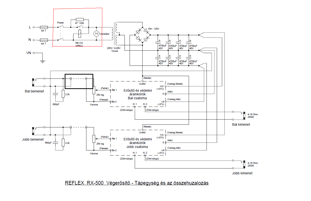 Ami a 220-at szakítja, az elvileg a lágyindítás lenne, ez azért kell, hogy hirteln ne rántsa meg a hálózatot amikor bekapcsolod, a másik relé a védelem, minden normális erősítőnél a hangszórókat kapcsolja le a végfoktól, amikor meghibásodás van, és DC-t kapna a hangszóró, ezt érzékeli, és leold. Tehát a működését úgy tudod ellenőrizni, hogy leforrasztod a hangszóró vezetéket az erősítőről, és adsz neki tápot, 0- emeled a feszt, 3v-nál már be kell kapcsolnia, legalábbis a 800-as reflexnek itt már behúzott a reléje. Ez az áramkör felelős még azért is, hogy ne a bekapcsolás pillanatában kapcsolja rá a hangszórókat az erősítőre, mert akkor "pattan"-hat egy nagyon, hanem később, amikor már lecsengtek a tranziensek. Nézd, rajz nélkül ha nagyon nagyon szeretnéd felújítani, akkor meg kellene értened a működését, készíteni egy vázlatot, mely kábel hova megy, mi miért van ott, majd a paneleken kicserélgetni az elkókat, ha kell kábeleket kicserélni, az elromlott végfokot megjavítani.