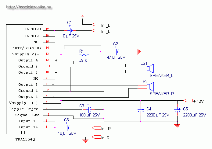 Szia, a kapcsolási rajzon egy TDA1554Q tipusú IC-vel felépített sztereó erősítő kapcsolási rajza látható. Egy erősítőnek van bemenete, ahova a CD-t, miegymást kötöd, illetve van egy kimenete, ahova a hangszóróidat. Mivel sztereó van jobb és bal oldala. ebben az esetben az IN L és az IN R a bemenet, ide kell kötni a CD-t, az LS1 és LS2 a kimenet, azaz a hangszóróra.