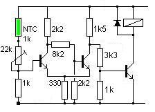 A meg nem írt ellenállás, poti értéke függ az NTC-től, azt csak akkor írom le, ha pl. ezt választod és megadod, hány k-s lesz ( vagy kiszámolod...). A lényeg az, hogy "hidegen" a 2. láb feszültsége magasabb legyen, mint a 3-as. A hiszterézis a 2M2 változtatásával lehetséges.