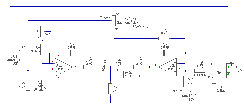 Akkor leírom még 1x. Noh, ezt a kis egyszerű áramkört én pont e célra terveztem. Lényege tehát, hogy egy trimerel betudod kalibrálni az adott borda hőmérsékletére eső kimeneti ventilátor feszültséget. Tehát ha 25C fokos a bordád (nyugalmi helyzetben mondjuk) akkor betudod a trimerrel lőni, hogy alig épphogy forogjon (2-3V feszültség essen a ventiden) Majd ahogy melegszik a borda onnantól fokozatosan a hőmérséklet függvényében kezd el magasabb feszültséget adni a ventilátornak. 85C nál már szinte a bemeneti teljes tápfeszt engedi ki. Értelemszerűen ha hűl vissza a borda akkor azzal egyenesen arányosan csökkenti majd a kimeti feszültséget (fordulatot). Még egyszer tehát,a trimmer azért van hogy betudd vele állítani az Úgynevezett "nyugalmi- alapjárati" fordulatot. Jah és a bekapcsolását meg egy segédtápegység kapcsolásával akár késletetni is tudod