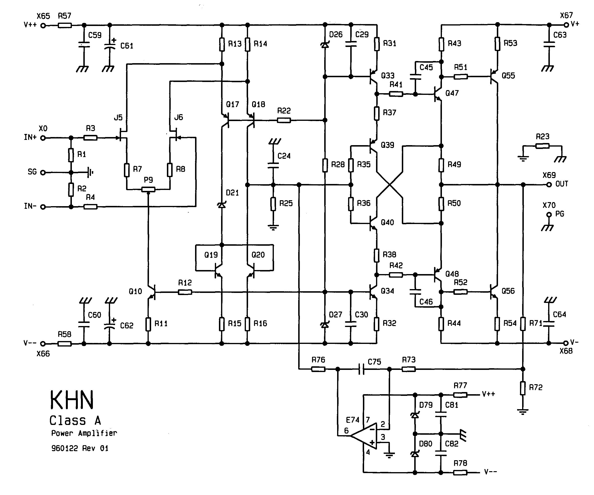 Okos, szépen kimunkált kapcsolás. Nem igazi A osztálynak szánták szerintem, bár annak is beállítható. Az okosság benne az, hogy Q39, Q40 árama mindig egy kicsit nyitva tartja a végtranzisztorokat. Ezeknek a tranzisztoroknak a kollektor árama elvileg a tápba is bevezethető lenne, de ekkor megszűnik ez a hatás. Ha betartjuk, hogy R39, R40, R49, R50 azonos értékűek, akkor a torzítás is nagyon jó lesz. Az IC hangfrekisen nem működik, a kimeneti DC-t húzza nullára.