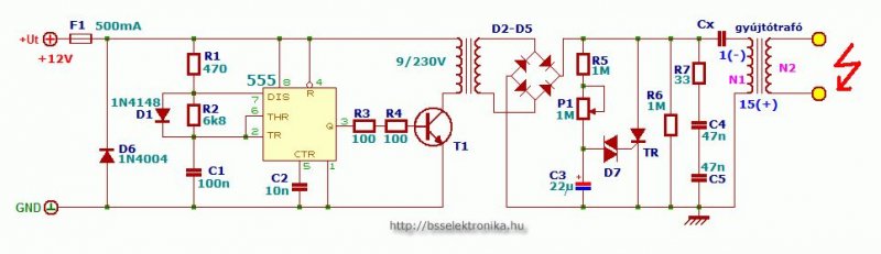 A kapcsolásra vissza térve, ha nincs tapasztalatod elektronikában, akkor ereszd el ezt a feladatot, nem kezdő pálya. Ilyen erejű villanypásztor rajz szerintem nincs itt közölve, vagyis, ha azt mondják és gyújtótrafóval van készítve akkor az nem annyi. Ha ezt a lapot végig olvasod látod, itt feszegetjük a saját tekercselésű nagyfesz trafó elkészítését, én is most akarok kísérletezni vele, (csak nincs elég időm egyelőre) de ha valaki ír egy használható receptet akkor olyanban kellene gondolkoznod, de ha nem tekercseltél még, lehet nem ilyen trafóval kellene kezdened.