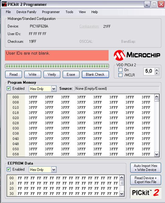 16F628A-t szeretnék égetni PICkit2-vel, de valamiért nem akar működni, Törlés után a Blank Check-re azt írja ki hogy "User IDs are not blank."