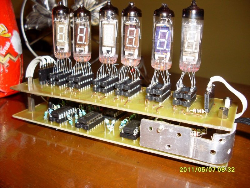 Kezd a végéhez érni a projektem. Már a nyák el is készült. Oda jutottam, hogy a tápegységet levettem a nyákról, így maga az óra sokkal kisebb lehet, míg a táp egy külön dobozban bárhová rakható. Szereztem egy nyomtatótápot ami +33V-ot és +15V-ot ad, mindkettőt 533mA terhelhetőséggel. A +33V-ot kapják a szegmensek és a rács, a +15V-ot pedig 7805-tel +5V-á alakítom. Minden szép és jó és a fényerővel is elégedett vagyok. Sajnos a képen az is látszik, hogy továbbra sem vagyok mestere az egyenes fűrészelésnek, de igyekszem javulni...