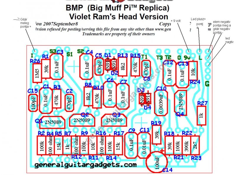 Sziasztok bekötés hiján elkészült a big muff.A bekötéshez szeretnék egy kis segítséget nem szeretném elszúrni a képre beírtam amiről volt fogalmam de ebbe sem vagyok biztos.Segítségeteket előre is köszönöm.
