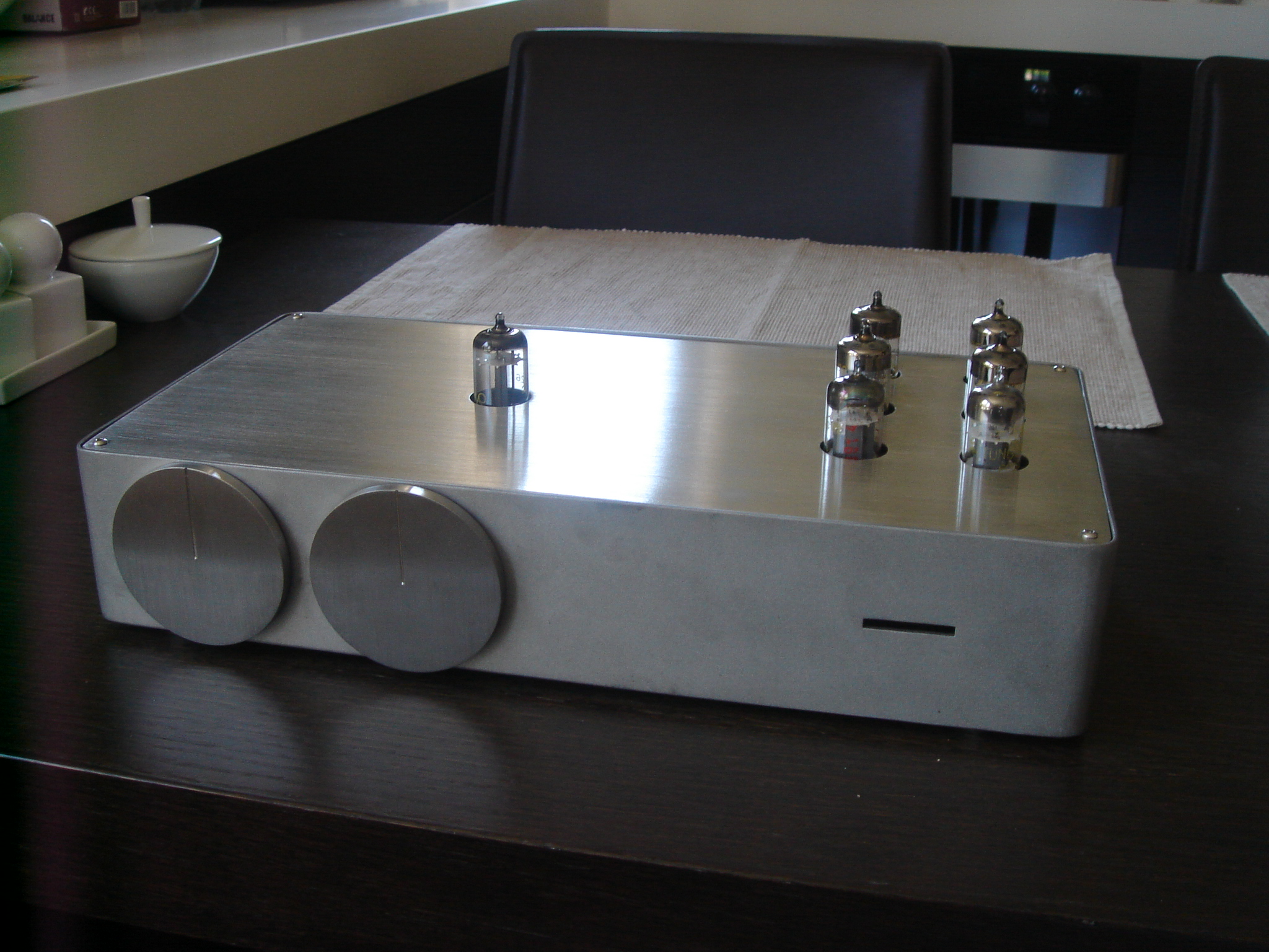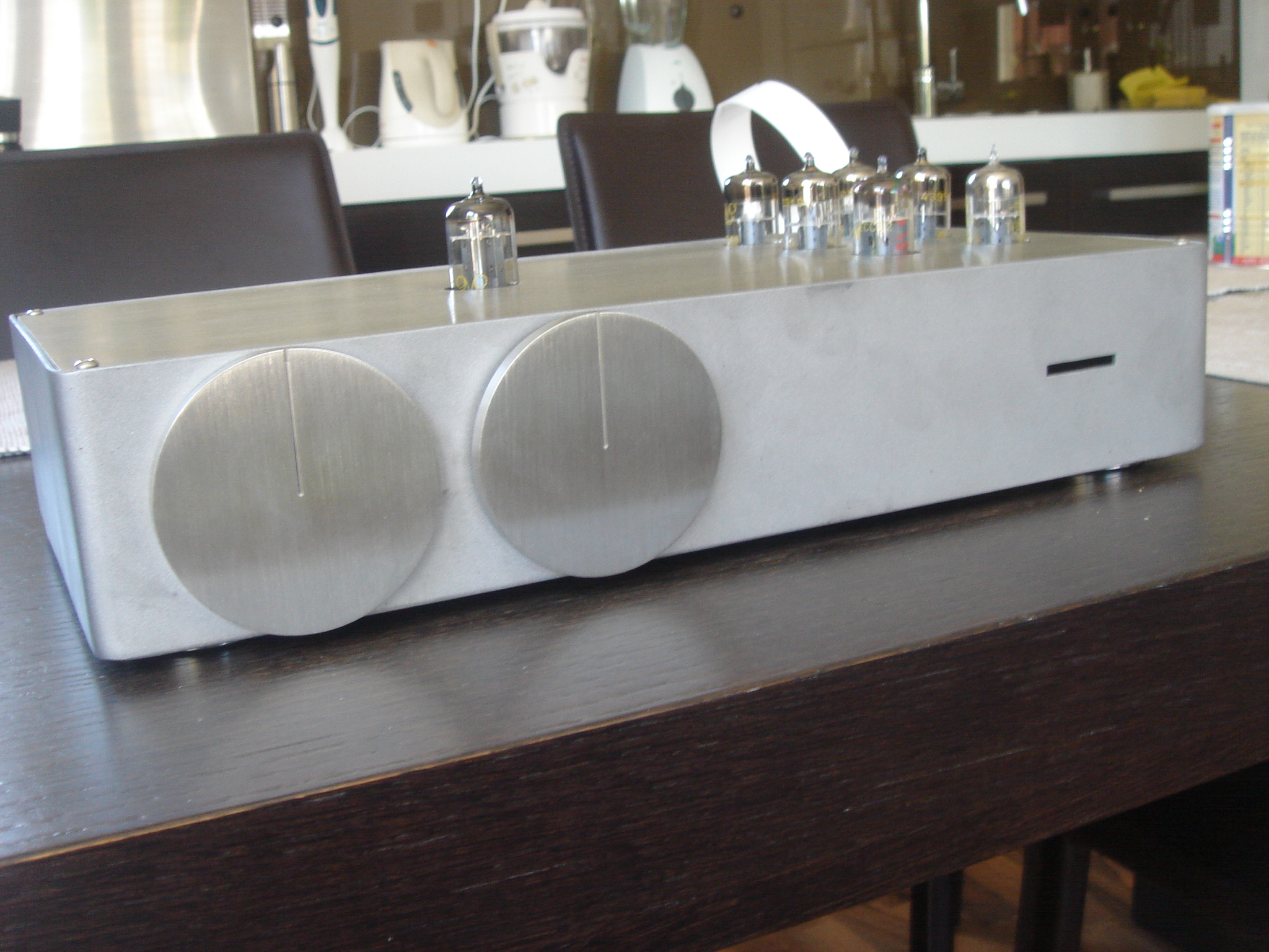 Hol is kezdjem... Egy neten talált kép egy iPod-os "kamu csöves erősítőről" ahol kilógott a dobozból két 6SN7 mutaóba a vége pedig IC-s volt erőteljesen inspirálni kezdett. Gondoltam megépítek egy ilyet de rendesen csövesre. A rendhagyó külsőhöz rendhagyó belső kívánkozott, így jutottam arra az elhatározásra hogy megépítem a '69-es Rádiótechnikában publikált ECC82 PP-t mert ez a kapcsolás amúgy is vagy két éve izgat. CHZ gyorsan tervezett hozzá DC csatolt ECC82-es előfok-fázisfordító fokozatot hogy csak egy féle csövet kelljen hozzá vadásznom, kapott még a szerkezet egy EZ81-es egyencsövet mert ebből van több új is fiók mélyén és máshova nem sok esélyem van elhasználni legalább is ami a távlati terveimet illeti és belekerült egy EM84 is hasonló okokból.Na itt mondom el gyorsan hogy ebből az egészből semmi sem lett volna CIROKL nélkül akinek ezúton is köszönök mindent. Valamint köszönet illeti még CHZ-t is a rettenet gyors segítségért és persze a "bejáratott" csapatban ott van még fleta is a trafóival. A kimenő alapanyagot Hans-tól kaptam (köszi Jani) jó szilíciumos EI talán Tavasz TV-k-ből. Teljesítménye papíron egy picit elmarad a mindenki által ismert PCL86 SE-től de a hangzása nekem dögösebb ahhoz amit én hallgatok. Azt gondoltam hogy ilyen kis kimenő teljesítmény mellett nem mutatkozik meg olyan markánsan az SE-PP hangzásbéli külömbség de most már tudom hogy igen. Deszkán már bizonyított ezért merem beutatni róla az összekábelezettlen képeket. A szürke vas keret még porfestve lesz ugyan ilyen szürkére. Bal oldali malomkerék on-off, jobb oldali hangerő. Az ikonjaikat még belegravíroztatom az AAÉT elött ahol testközelből is látható-hallható lesz.