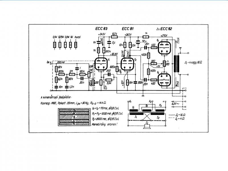 Tudom, sok a problémám, de sajnos csak PCL86-om van, ezért olcsóbb ha veszek egy 12V-os trafót arról oldom meg a fűtést. Megpróbálok beszerezni egy EZ81-et és akkor körülbelül 245V lesz az anódfésültség. Ha jól számoltam akkor az eredeti kapcsolásban is körülbelül annyi, tehát nem kell változtatni a kapcsoláson. És akkor nem mellesleg teljesen csöves lesz az erősítő