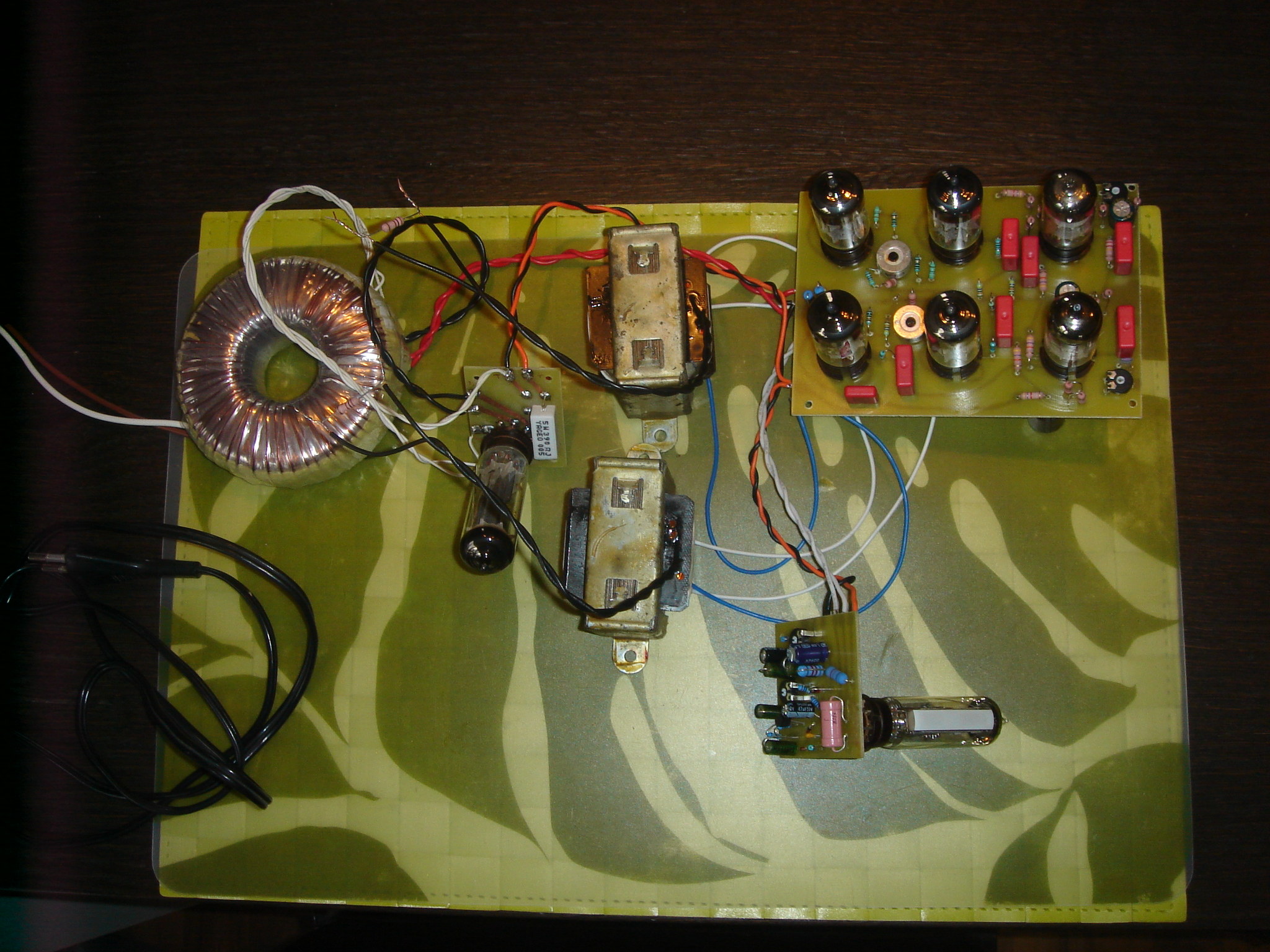 A végfokban módosítan kell néhány ellenállást mert sztereóban terhelve 300V körül lesz majd az anódfeszed. Triódánál: Anódellenállás 100k, katódellenállás 1,5k. Pentódánál katódellenállás 220 Ohm legyen.