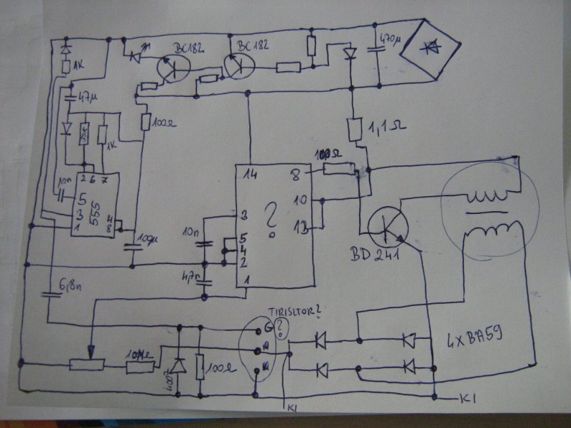 Ha e rajz szerint csináltad : , jónak kell lennie. Az eredeti rajzhoz képest annyi a változtatás, hogy az 555-ös 7-es lábához kapcsolódó diódát fordítva kell betenni (ez sajnos az eredetin hibásan lett berajzolva), és kikerült belőle a BFY34-es tranyó a 15, és 820 ohmos ellenállásokkal együtt. Plussz az 555-ös 3-as lábához kapcsolódó 100 ohmost, én 50-esre cseréltem. Így max. ~20-22mm-es szikrát vág csutkára tekerve, egy Bosch trafóval. ET ÖRÖM ÉT BÓDOTTÁG!