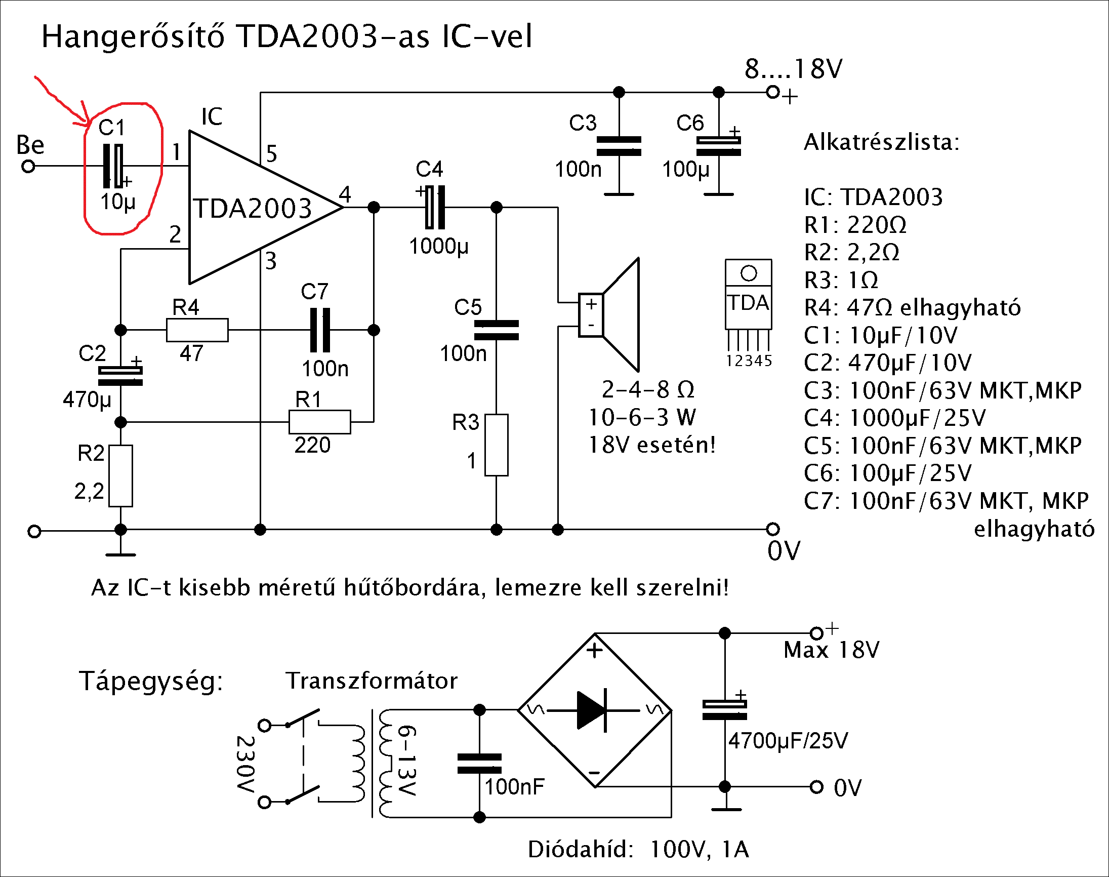 Helló! Szívesen segítenék, csak nem tudom mire való a kapcsolás. Kérlek írd le, hogy mire szánod. Már a TDA2003 visszacsatolása is gyanús.