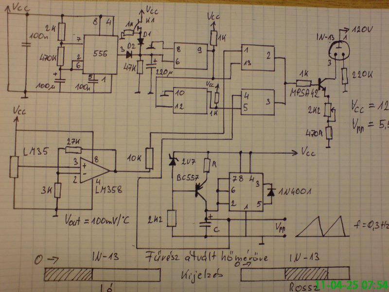 Először is Kellemes Húsvéti Ünnepeket kívánok mindenkinek,és most ne csak a forrasztóón folyjon, de más is...../ kölni / Azt szeretném kérdezni, hogy van egy nixie órám, amelyben egy IN-13 plazmacső jelzi a másodpercet. Ennek elkészítésében köszönöm Vic mester önzetlen segítségét!!! Arra gondoltam, hogy ezt kiváltom egy hőmérővel. Készítettem 555-el egy fűrészjelgenerátort,és egy hőmérőt /LM 35 + 358/, rátettem egy 4066-ra, amely egy mulivibrátorral váltogatja a két jelet.Külön -külön mindkettő kiválóan működik. A gond az, ha a multi magas szinten van, amikor átvált, akkor a hőmérsékletjelzés eltolódik a cső felső harmadába.Mivel tudnám ilyenkor lehúzni? Várom segítségeteket Üdv: Csupasz