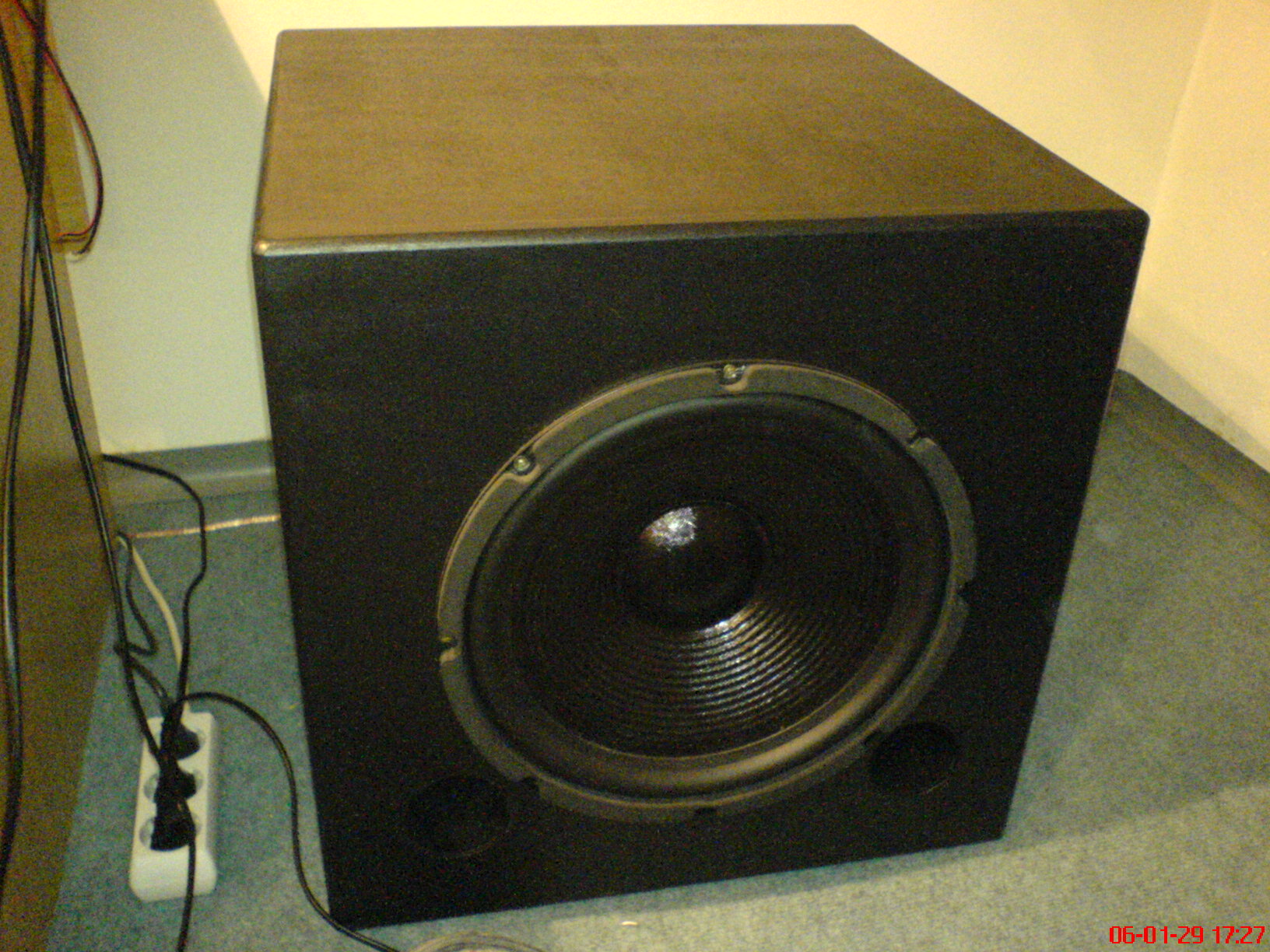 Ezt a mélynyomót úgy egy éve csináltam. Egy 30centis Somogyi van benne. Kb 68 literes. A doboz 19mm-es rétegelt nyírfábol van ami sokkal jobb merevséget ad mint az MDF. Na megpersze szerintem igényesebb is. Miellőtt valaki megijedne a festés miatt (tudom ez sokak szerint felér egy gyílkossággal) nem egy egyszerű fekete festék. Egy Finn gyártmányú, Vinha nevű vízbázisú fa festékről van szó ami beszívódik a fába és a rugalmasága nagyságrendekkel jobb mint a műanyag alapú festékeké. Faragasztóval és úgynevezett kekszekkel van összerakva a doboz, persze szilikonnal szigetelve. Csillapítóanyag nics mert a mélyhangokknak az úgysem használ. A Somogyi miatt nem megy elég mélyre de ez csak egy kiegésszítés a kis Sony mikrohifimhez. Ahhoz maga a tökély. Egy 30Wattos erőssítővel hajtom. Ami tekintve hogy kicsi a szobám elegendő Isa