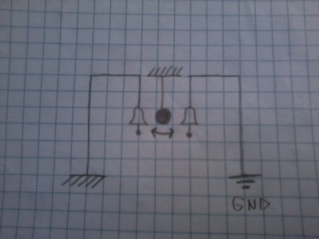 Ide firkantottam a sematikus rajzom.A jó öreg Franklin találta fel. Van két rézcsengő,egyik szigetelt a másik Földelt.A kettő közt van egy fém golyó,és elkezdi csengetni a két csengőt,ahogy átviszi a töltést az egyik csengőről a másikra.Ugyanis a töltés különbség 'megelőzi a vihart'. Lényegében cseng a vihar előtt,a Discoveryn láttam egyszer meg is építem