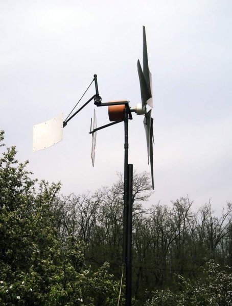 Szélgépfénykép nézegetéshez: a viharvédelme az interneten elérhető számolás alapján lett elkészítve, bár picit módosítottam rajta, amit itt a fórumon meg is beszéltünk. A szélkerék átmérője 1,6 méter, a lapátokat 20x3-as laposvas tartja, a PVC cső 2 mm-es falvastagságú volt, ezt örvénylő széllökésekben is jól védte ez a figura.