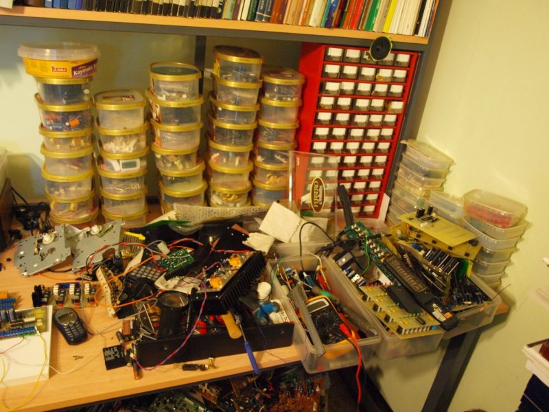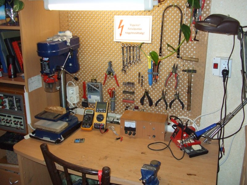 Jelenleg alig több 3 m2-nél a műhely. Ebben a polcok, az asztal, a szék. És az ajtó is befelé nyílik. Az új műhelyben az elektronikai asztalom 2 m2 lesz. Három ablakon dől be majd a fény mert elegem van a sötétből. A helység másik felében a mechanikus műhely lesz.Satupad, oszlopos fúrógép, eszterga és asztali köszörű. Idézet: „Én évek óta nem raktározok semmi feleslegest.” Ezt mondani nagyon könnyű, de mikor dönteni kell egy kincset kézben tartva -ami tuti, hogy sose fog kelleni csak mégis kedves valamiért-, akkor már nem olyan egyszerű kukába dobni. De valóban ez a dolog nyitja!