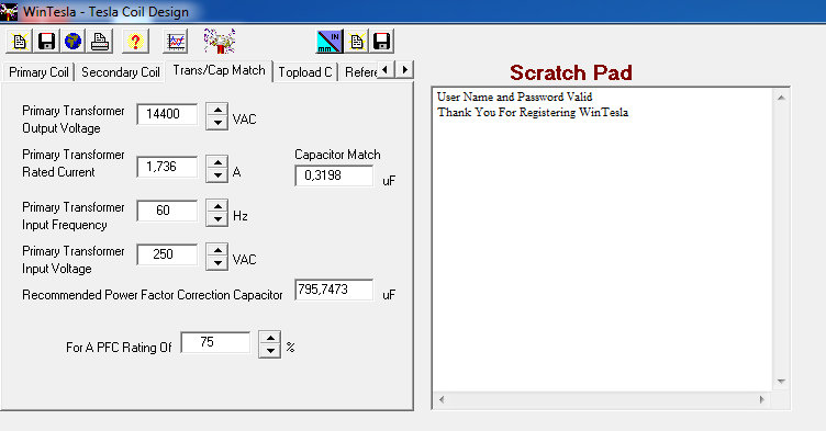 Azaz amint az elébb már írtam: ez az a kondenzátor érték, amit a tápláló frekvencia és a trafó üzemi névleges árama ("rated current") és az üresjárási kapocsfeszültség ("primary transformer out voltage") határoz meg: Rb = Uki / I ki = Xc = 1 / (2 * Pi * f * C). (Rb: a trafó belső ellenállása, Uki: kapcsofesz, Iki: üzemi áram, Xc: kondi impedanciája, f: a hálózat frekvenciája, nálunk 50Hz) Természetesen ezzel vigyázni kell, nehogy rezonancia alakuljon ki, mert a kondenzátor, de a trafó is bánhatja! Nagyon fontos a megfelelő védő szikraköz bekötése a primer kondenzátorral párhuzamosan, hogy a feszültség-túllövéseket levezesse, nehogy átüsse a kondit, vagy a trafó szigetelését. Túllövés keletkezhet abból is, ha a rezonancia közelébe méretezett kondenzátor esetében valami miatt kimarad a kapcsoló szikraköz gyújtása (főleg hangolásnál és/vagy aszinkron szikraköz esetén). "-recommended power factor correction capacitor= ez mi?" : a javasolt fázisszög-javító (teljesítméntényező-javító, lásd: cosφ) kondenzátor értéke, ez a táptrafó primer körébe kötendő, párhuzamosan a hálózati tekerccsel. "-for a pfc rating of...%=ez mi?" : a fázisszögjavítás mértéke, %-ban. Ennyivel javítja a teljesítménytényezőt a megadott PFC. Változtatásával változik a PFC értéke. De továbbra is javaslom a TeslaMap-ot, a wintesla eléggé gagyi kialakítású.