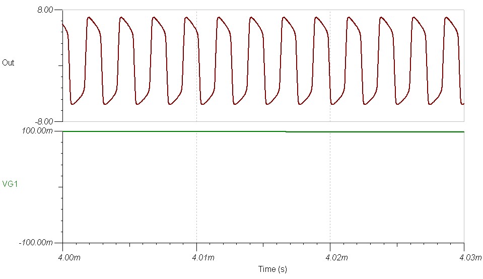 Én megpróbáltam Tinában szimulálni a kapcsolást, a bemenetre egy 100mV -os szinuszjelet kötve, de nagyon csúnya dolgok vannak a kimeneten.