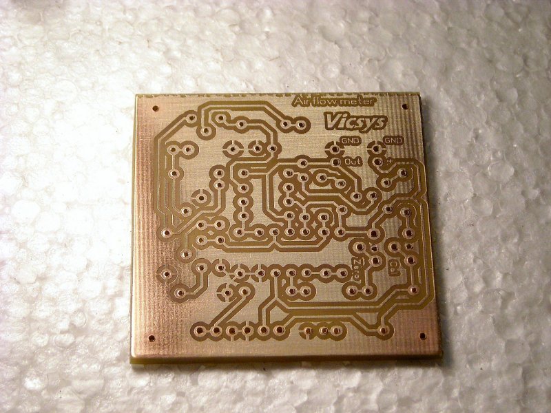 (Csak a huzat nagyságát kell indikálni, pontos érték nem fontos. Emiatt nincs óra és PIC.) Az egész panel 50x50mm, kényelmesen elfér a tenyeremben. A nyákot inkább a feliratok miatt tettem fel. Dobozolni, majd csak akkor fogom, ha kellően be lehet lőni. Nagy gondban nem leszek, mert kicsi, lapos, aranyos.