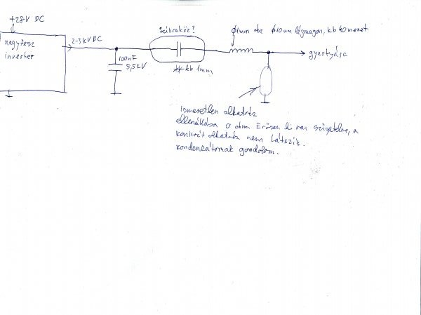 Lehet akkor inkább egy mikróhullámú sütő trafójával kellene megpróbálkoznod,és azt egy relével megszaggatni,egyszerű és nagyszerű,és akkor nem kell semmilyen kondi mert a MOT-ban is van elég szufla...