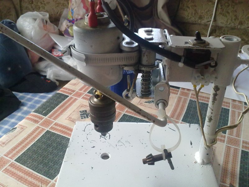 Nézegetem egy ideje itt a topikban a szép megoldásokat. Felteszem az én panelfúróm képét is, hogy ötletet adjak másoknak. Ennek az asztala mozog, nem az orsója (motorja). Nem annyira házilagos kivitel, egy azóta elhunyt szerszámkészítő munkatársam csinálta gépműhelyben, de ötletnek jó lehet valakinek. A motorja egy ablaktörlő motor, az áttétele le van fűrészelve (esztergálva) róla. A motor tengelye menetes, arra csavarodik fel a tokmány. 3-as fúróig akár vasat is lehet fúrni vele. Akkoriban ilyen tokmányt csak román kézifúrókból lehetett szerezni, mostanában kapható ilyen külön is.