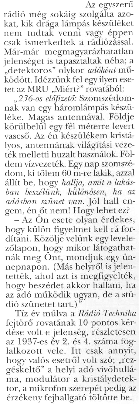Idézet: „az egyik előfizető arról számolt be a közönségszolgálatnak, hogy neki detetktoros vevője van és a 60m-re lakó szomszédja, aki lámpás audionnal rádiózik hallja, főképp adásszünetben, hogy mit beszélgetnek a lakásban!!!” A dolog ikább fordítva képzelhetző el, és semmi titokzatossság nincs benne. A lényeg itt bújik meg "főképp adásszünetben" A történet szerintem arról szól hogy a visszacsatolt audiont a tulaj addíg tekergette amíg "begerjedt" a korabeli szóhasználataal éve (oszcillátoként, adóként működött) és valószinűleg valamelyik alkatrész átvette a hangrezgéseket (A mikrofónia, gyakori jelenség volt az elektroncsöves technikában, de egyéb alkatrész is is okozhatja) ami modulálta a túlcsatolt audion jelét.Ezt minden gond nélkül lehetett venni egy detektorossal. A régi szép időkben amikor még audionokat/visszacsatolt audionokat építettünk és őrületbe kergettük a szomszédokat ha túl hangosan hallgatták a "jó ebédhez szól a nóta" c. műsot.
