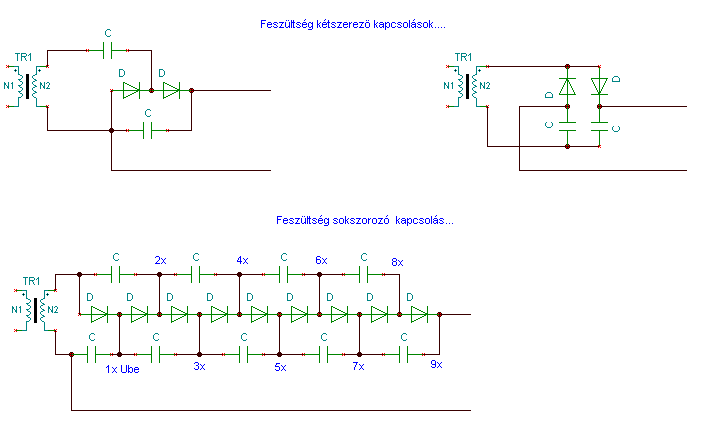 Íme a diódás sokszorozó rajza... Több diódával értelemszerüen "folytatható" az áramkör, ha nagyobb kimenö feszültség kell.