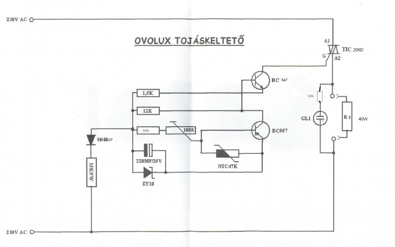 De mivel a teljes keltető hőtehetetlensége relative óriási, a relés fűtés is lehet pont olyan pontos, mint a triakos. De egy mechanikus kontaktussal ellátott eszköz élettartama általában jóval alacsonyabb, mint a tisztán elektromos eszközöké. Az első kapcsolás, amit egy ismerősömtől kaptam még kb. 1997-ben, az relés volt, az érzékelője meg egy tranzisztor. Saját tojásokból nekünk 55-80% közötti kelés volt. Sajnos a tranyó is gyakran fogyott, és a relét is triakra kellett alakítani. Most a 3. generációs továbbfejlesztett kialakítás rokonoknál üzemel, és tavasszal a törpe tyúkoknál 100%-os eredményt értek el. Na az már triakos, de egyébként 3 műveleti erősítő az egész. Első kettő fokozat jelerősítés, a 3. meg komparátor. Szabályozás on-off. Most viszont egy digitális, több-hőmérős, PI jellegű, PWM szabályozós, légkeverős, páraszabályozós, motoros forgatós... keltetőn töröm a fejem. Ha kész leszek (úgy számolom, hogy kb tél elején), akkor majd felteszem ide is.