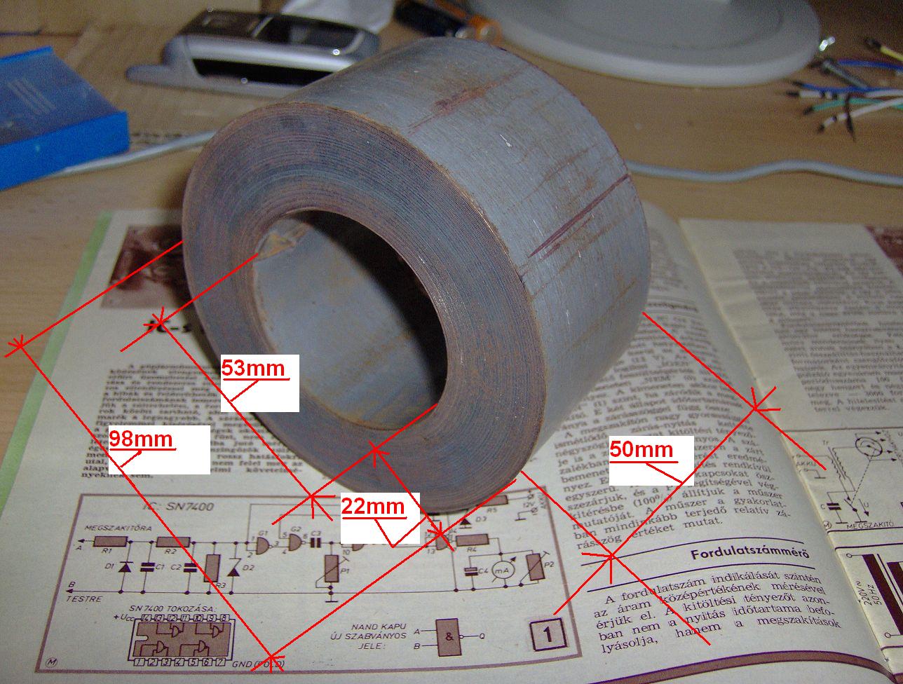 Első dolog a vasmag szigetelése,utánna jöhet a primer tekercs.. Aztán a vasmagkeresztmetszet meghatározása:Külső átmérő-a belső átmérő/2*magasság,, A te vasadon a következő:98cm-53cm/2*5cm=11,25cm2 Erre,huzaltól-frekvenciától-menetszámtól-és még pár adattól függ a teljesitménye is,, Igy a teljesitménye relativ,,3-500watt amilyen pontos lessz a számitás és a huzalkeresztmetszet,,és a tekerés sikeressége. A számitást átadom a kedves kolegáknak..