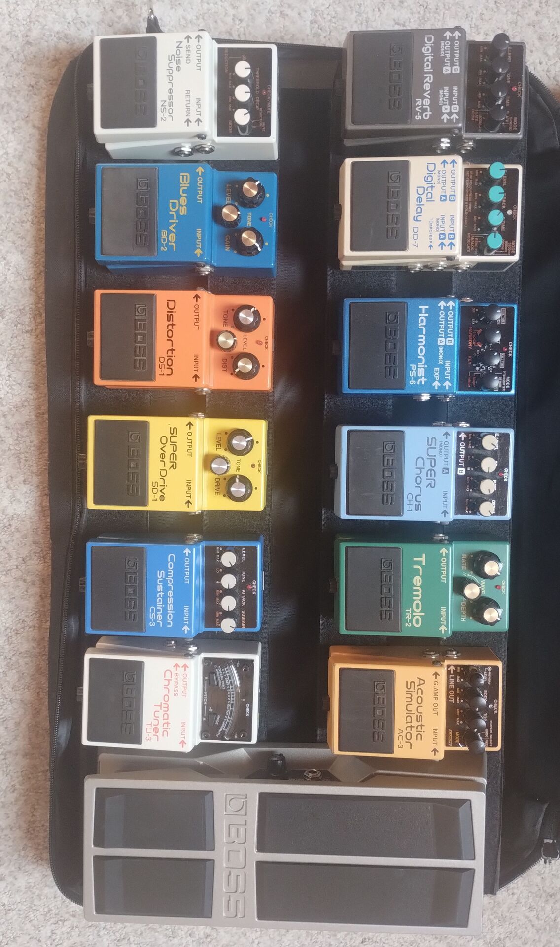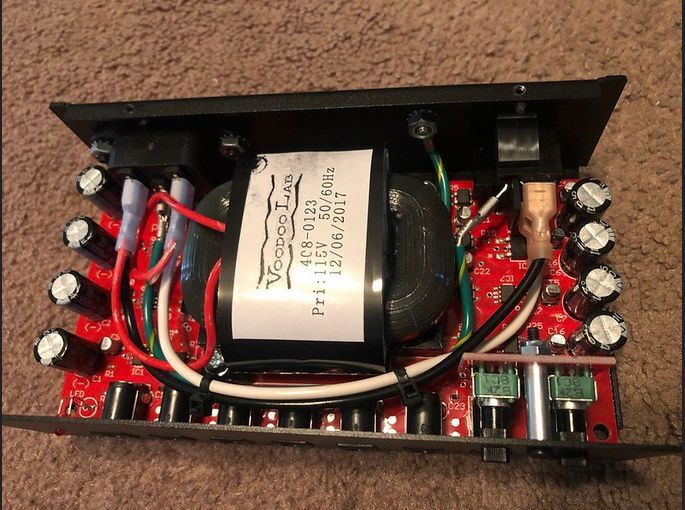 Mivel az effektek alatt helyezkedik el a pedalboard alján, a szórt mágneses tér ősi ellenség, kerülendő. A tápot betehetem ugyan vaslemez dobozba, de az effektek háza alu öntvény. Azonkîvül a hely is korlátozott, a doboz magassága max. 35 mm lehet, tehát egy combosabb toroid már nem nyerő. Addig is amíg valaha is elkészül, csak vettem a Thoman.de oldalról egy Harley-Benton 12 aljzatos, külső dugasztápos dobozt, a hiányzó villanyt majd szintén stabilizált dugasztáppal pótolom.