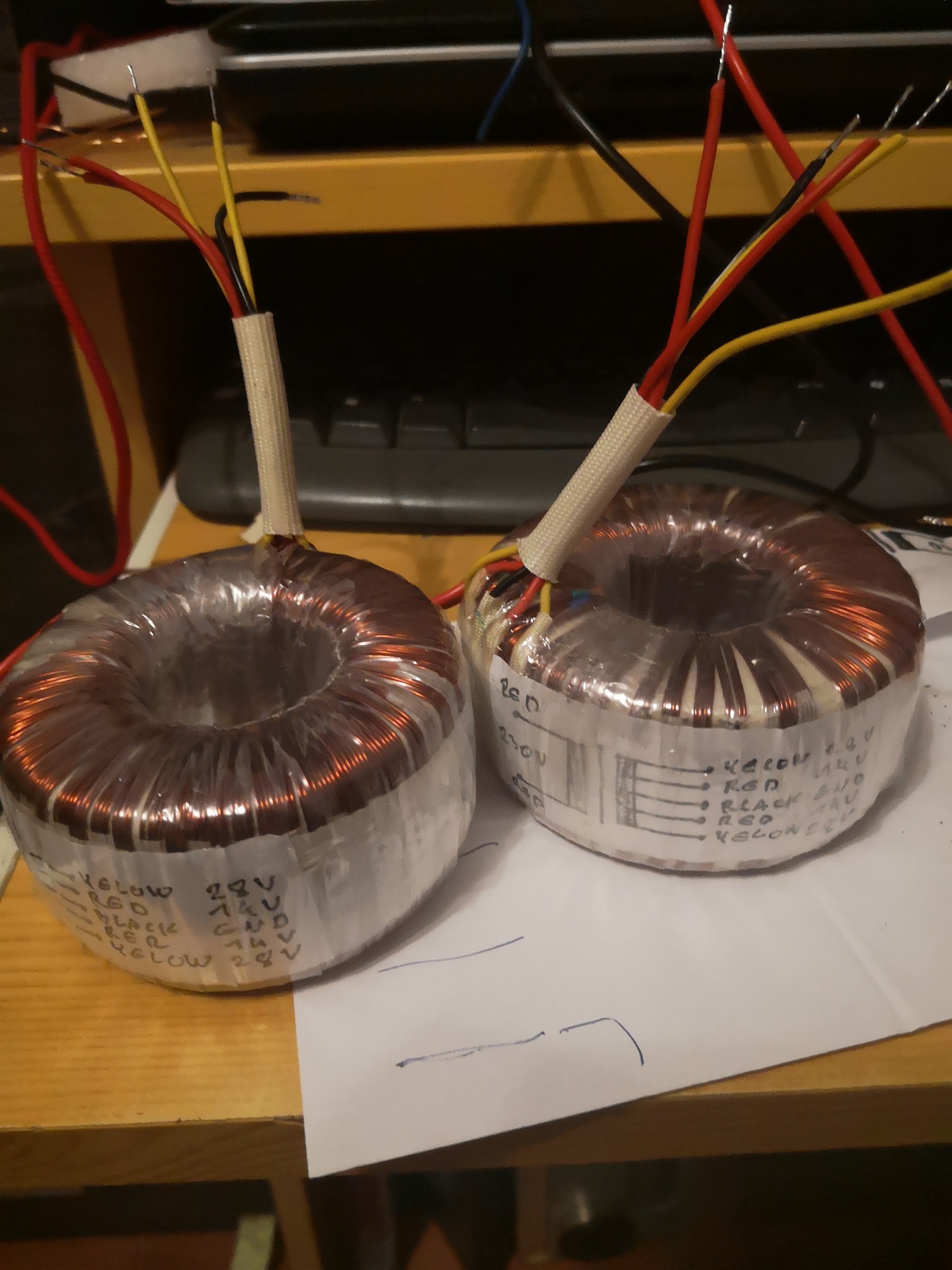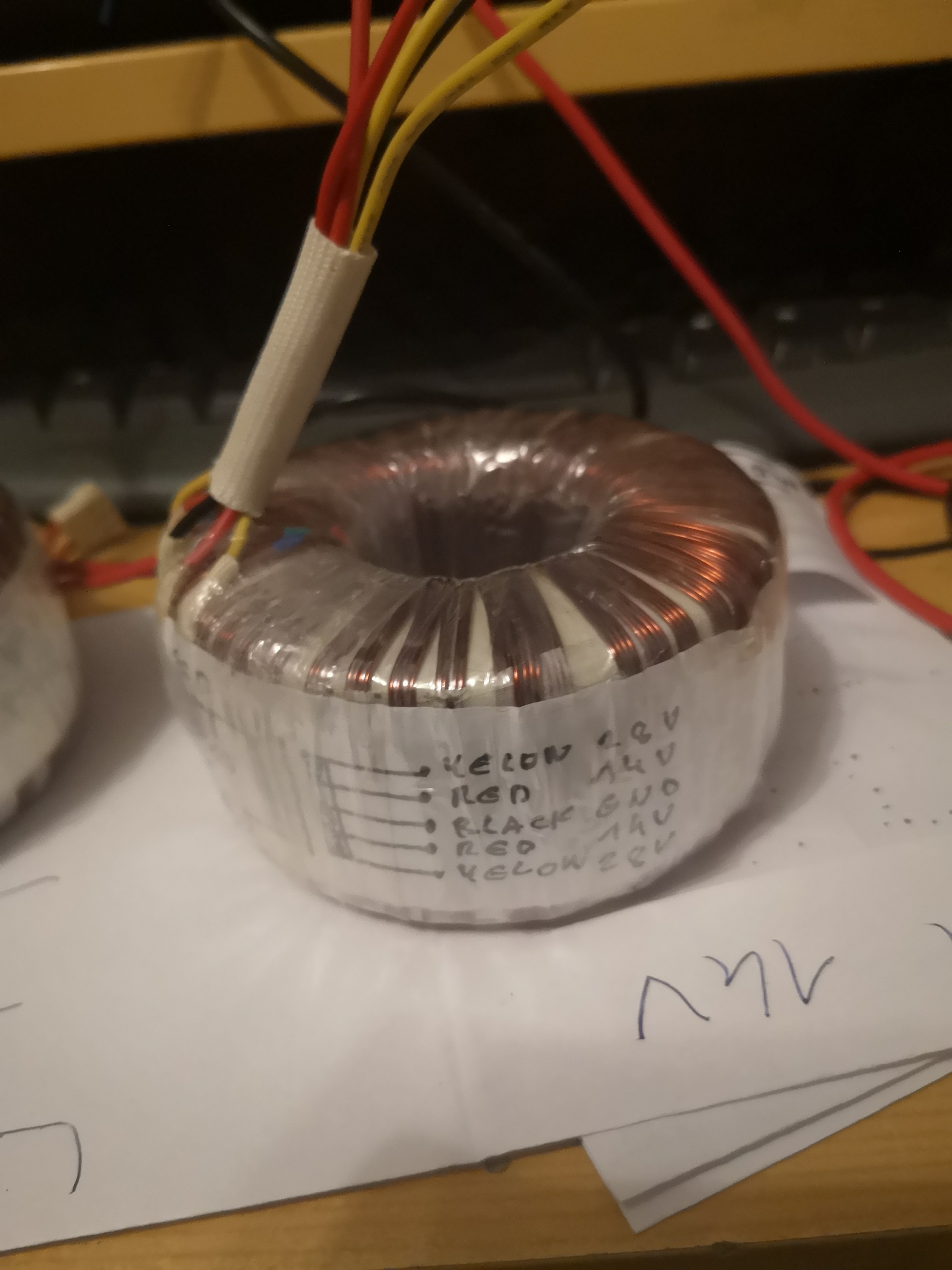 Nem. Mivel viszonylag kis feszültségekről és alacsony menetszámokról van szó, megengedhető a párhuzamos tekerés. Előzetes tervezés után 4X9m 0,75-ös huzal felkerült egy vetélőre. Ezt minden toroidos ismeri. A teljes szekunder két rétegben került fel. Az első rétegnél vigyáztam, hogy a huzalok ne keresztezzék egymást. Erre jött egy szigetelő réteg, majd a második réteg huzal négyes. Itt is vigyázva mind a sorrendbe, mind a kereszteződés elkerülésére. A végén kötöttem sorba a négy szekundert. Nem saját ötlet, gyári trafó bontáskor (gyakran jutok hozzá nem megfelelő szekunder feszültségű trafóhoz olcsón) láttam, hogy így készítik a szekundert.
