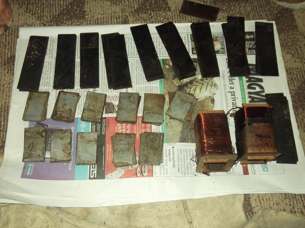 48 db. hosszú elemet(110mm-est) szoríts össze satuban(nem túl erősen, csak annyira, hogy nehezen tudj 1 darabot kirángatni közülük), ez lesz a pakett vastagság; ezt mérd meg. Ennyiszer a szélesség(31mm)=vaskeresztmetszet: na ezután lehet kiszámolni a valóban kivehető teljesítményt, és meghatározni a menetszámokat, és a drót átmérőket!