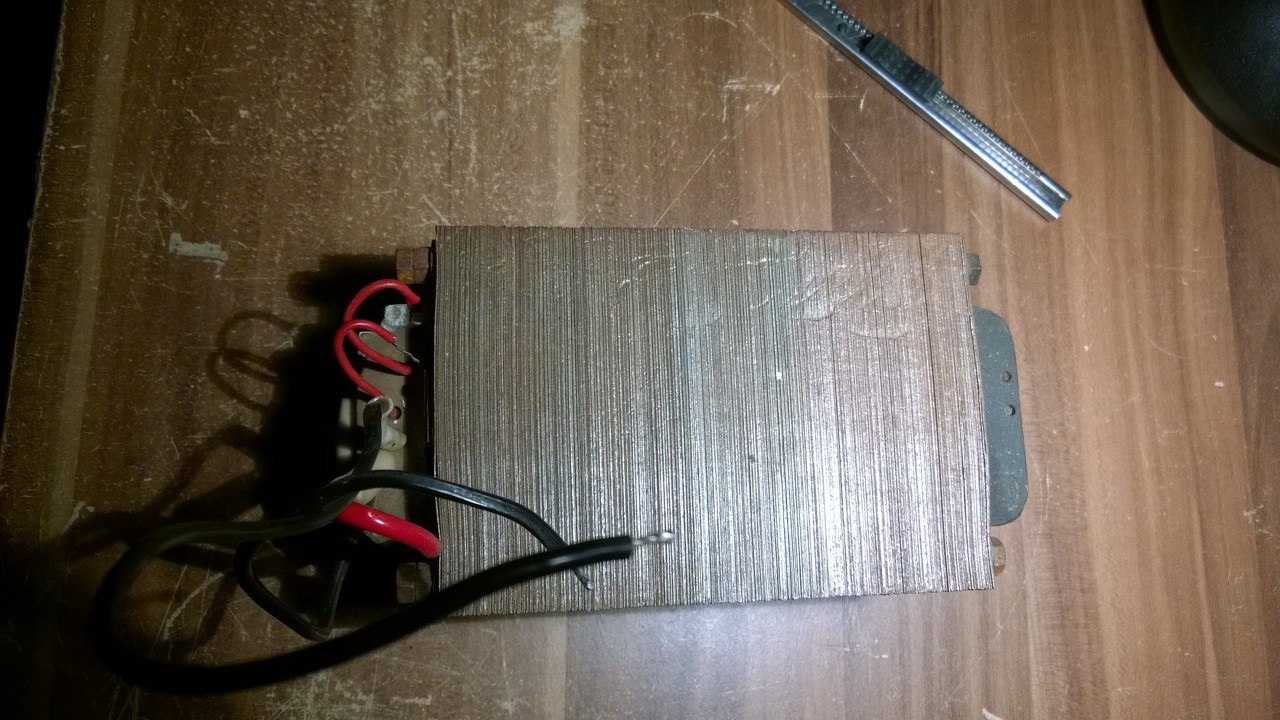 Van nekem egy transzformátorom, de sajnos nem tudom, hogy mekkora lehet a teljesítménye. Mellékeltem pár képet is róla. Méretei: 12,5cm hosszú, 8,5cm széles, 7cm magas. Primer: 0,7mm, Szekunder: 1,6mm-es dróttal van tekerve. Kb mekkora lehet ez a trafó? Jó nehéz is.