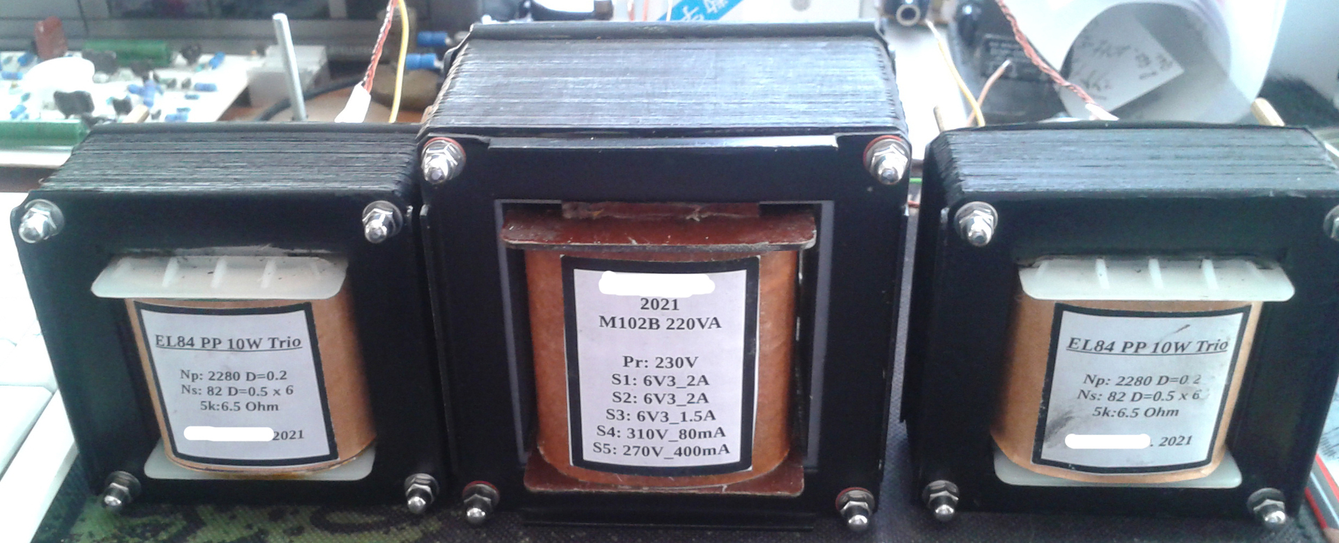 Most megint rám jött és tekertem egy "kiccsaládot". A hálózati a szokásos pempőbe áztatva, a kicsiket szárazon hagytam próbaképp. Összefogatáshoz s.réz pálcika, ráfaragott M4-es menettel lett használva. A hálózati pr/sec között árnyékoló rézfólia. Az együttes egy régi rajz alapján készült, 2x10W-os triódás PP EL84-eket fog szolgálni.