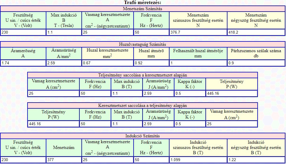 Biztos, én nem szeretem az ilyen számolókákat, nem is használok ilyet. Már csak azért sem, mert az egyik legfontosabb dolgot, miszerint mennyire gerjeszthető az adott vas, azt a számolóka nem tudja, azt meg kell mérni összerakott vassal. Hiába írok én be oda 1T-t ha az adott vasnak a 0,9 is sok, vagy éppen az 1,25-tel is vígan el van. Meg feszültségesésre sem egyszerű számolni mert az is több mindentől függ. Csöves tápnál szúrt szemet, hogy 500V esetén az adott százalékos eltérés már nem annyi lesz feszültségben mint mondjuk 30V esetén, és emiatt mondjuk 50V-tal nagyobbra kell tekerni a szekundert. A 30V-nál egy 10%-os feszültségesésnél 27V marad, 400V-nál már csak 360V.