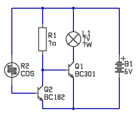 Ez a Proli007 által feltett kapcsolás. Ilyet szeretnék építeni. Az lenne a lényeg, hogy egy zseblámpaizzó (3,8V) zsebtelepről működtetve (4,5V) bekapcsoljon, és bekapcsolva maradjon mindaddig, míg a fényérzékelő egy bizonyos fényerősséget érzékel. A fényerősség, amire szükségem lenne annyi, amit a zseblámpaizzó kb 15 cm távolságból produkál. Ma kipróbáltam, hogy a BC301 bázisára 1kOhm ellenálláson kötöttem a tápra. Ekkor kb. 4,5 mA bázisáram, és 260 mA kollektoráram folyt. A tranzisztor eközben nagyon felmelegedett. Az izzó fényereje kb 60%-a volt annak, mint amikor az izzót közvetlenül a telepre csatlakoztatom. Ebben az esetben az izzón 330 mA áram folyt. Számításaim szerint ehhez kb. 5-6 mA bázisáramra van szükség. Tudom, hogy már kérdeztem, de nem volt világos a válasz. Mikor melegszik jobban a tranzisztor? Ha teljesen nyitva van, vagy ha a korlátozzuk?