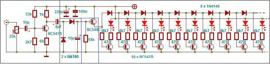 Köss 10k-100k ellenállásokat a rajzon BC549C típusú tranzisztor bázisa és kollektora (ez maga a pozitív táp) közé. A 18k ellenállással alkotott feszültségosztó bemenő jel nélküli stabil állapotot hoz létre. A 10k-val minden LED világít, a 100k-val kb. az első. Használhatsz 100k trimmert is, nullára tekerve sem károsodik az áramkör.