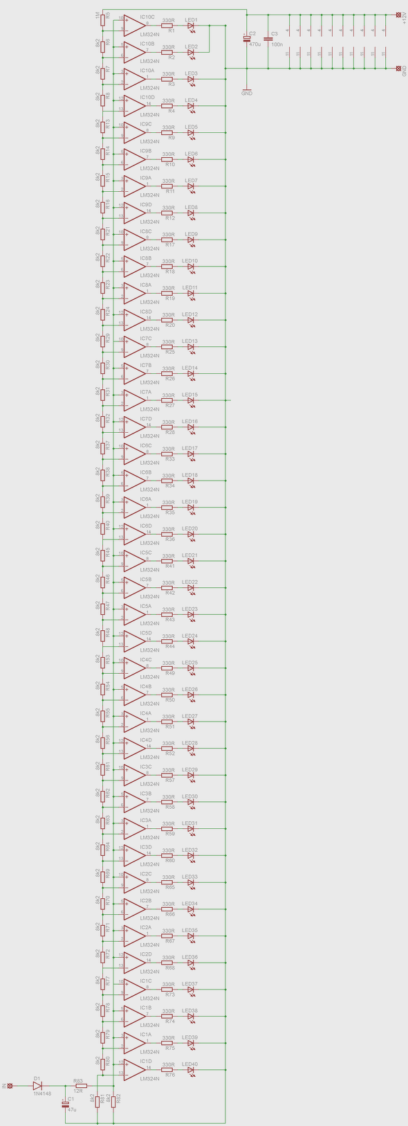 Megfelelő működik?Sziasztok! Megépítettem a mellékelt képen látható kivezérlésjelzőt, de nem vagyok meggyőződve, hogy megfelelően működik. Készítettem egy videót is. A ledek a zene ütemére villognak, viszont a sorban előrébb lévők kialszanak ha magasabb a jelszint. Azt gondoltam (de lehet csak én tévedek) hogy a jelszint növekedésével az elől lévőknek fixen kell világítaniuk és nem villoghatnának. A panelt többször ellenőriztem. Alkatrész értékek is a rajznak megfelelőek. Válaszokat előre is köszönöm!