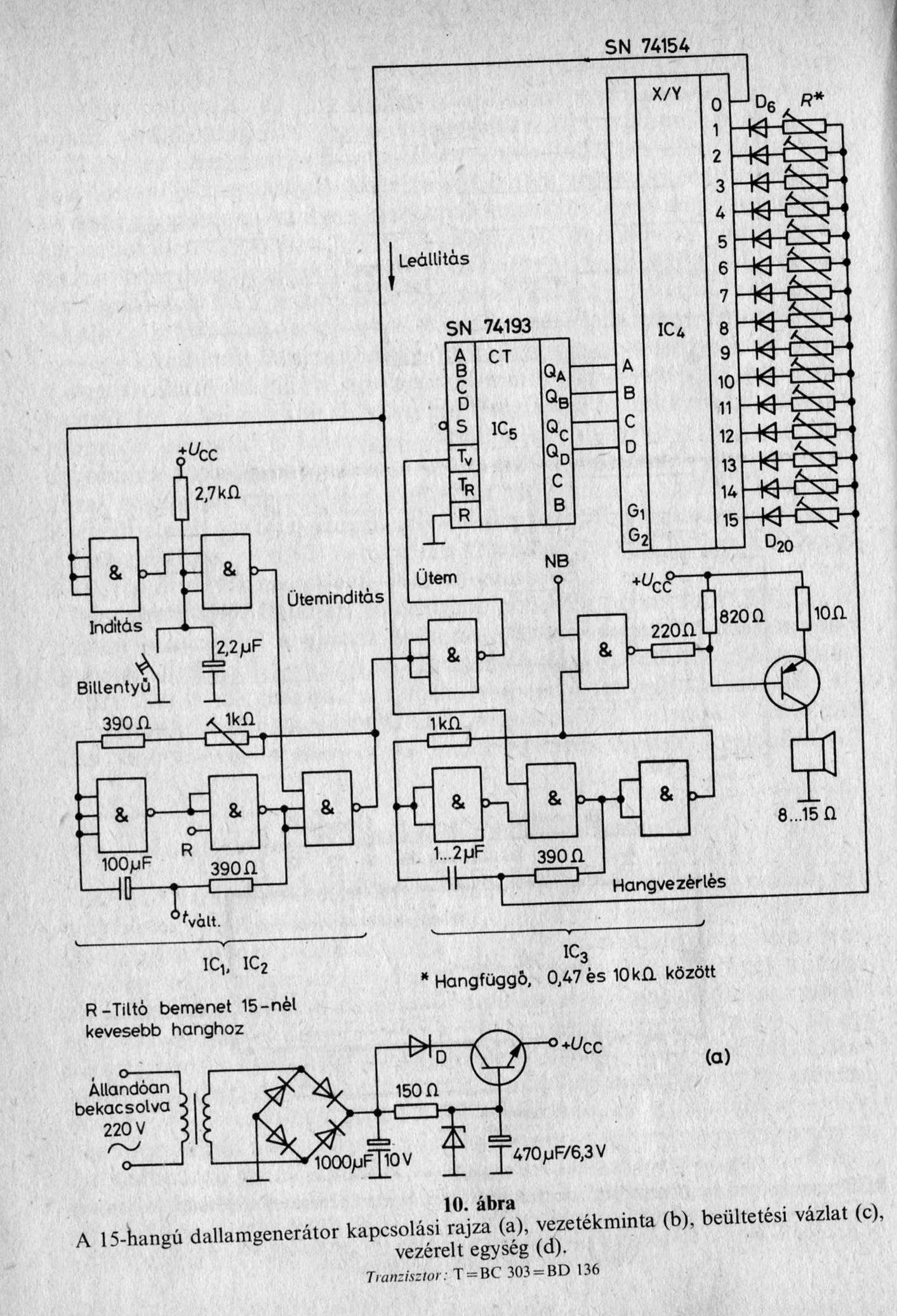 Valóban van benne 10 és 16 hangú dallamgenerátor. Az egyik ismerősőm régen meg is csinálta a 10 hangút, csak a fix ellenállások helyett trimmerpotikat tett bele. Azt nem tudjuk, hogy ő rontott el valamit, vagy a rajz volt rossz, de a hangokat nem egymás után, hanem egyszerre játszotta le, folyamatosan, megszakítás nélkül. Ilyen jó effektgenerátorunk még sose volt, a Forma-1-es motorhangtól, az űrhajó leszállásig rengeteg jó hangot tudtunk kikeverni De ettől függetlenül nem azt csinálta amit kellett. |