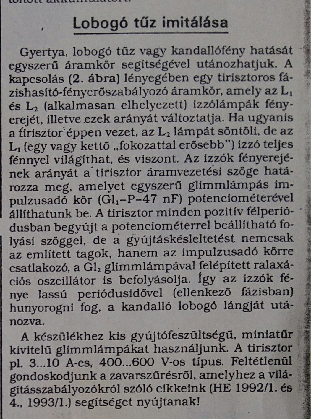 Sziasztok! A segítségeteket kérem. Keresek egy lobogó tüzet imitáló kapcsolást, hagyományos, izzószálas 230V-os izzóhoz. A "barátunk" most nem volt segítő kész és az idő is kicsit szorít. Valamelyik RT vagy HE-ban is van kis egyszerű áramkör. Ha lesz időm meg fogom keresni. ( Tudom, hogy ezt egy glim lámpás gyertya izzóval egyszerűen meg lehet oldani. De annak kicsi a fényereje. )