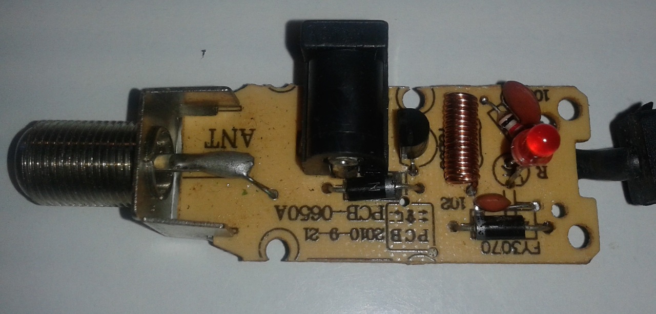 Igazából amit nem tudok, hogy miért van egy dióda a koax ágon. Vagyis tipp, hogy ha esetleg a TV felől jönne tápfesz, azt ne engedje tovább... bár akkor nem tudom, hogy a vele párhuzamosan kötött kondi nem engedné-e át... Mindenesetre ennek az alkatrésznek nem sok értelmét látom, szerintem simán elhagyható lenne. Igazából a led is tök felesleges, de ilyen apróságokon most nem akadok fenn.
