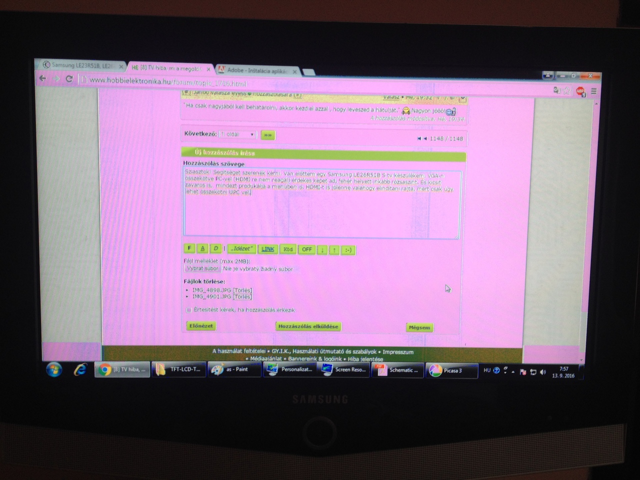 Sziasztok! Segítséget szerenék kérni. Van előttem egy Samsung LE26R51B S tv készülékem. VGA-n összekötve PC-vel (HDMI re nem reagál) érdekes képet ad, fehér helyett inkább rózsaszínt. És kicsit zavaros is, mindezt produkálja a menüben is. HDMI-t is jólenne valahogy elindítani rajta, mert csak úgy lehet összekötni UPC vel.