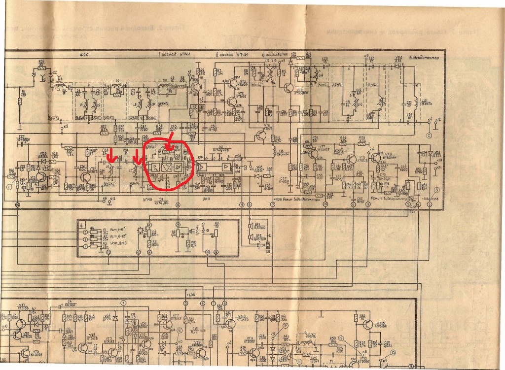 Ha jól látom, akkor ebben a tévében IC-s hangáramkör van, egy koincidencia- demodulátorral, olyan, mint a TBA120 és egy IC-s végfokkal. Megjelöltem a hangolandó tekercseket, amelyekbe befelé kell tekerni a vasmagot az 5,5 MHz-es segédvivő behangolásához.